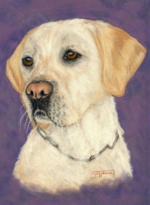 Now the paper?  My goodness it was beautiful!  I used Hehnemule Velour paper and it felt like I was drawing on fabric..it’s that soft, pliable and thick.  I see why a lot of artists use it.  I picked a color that was  almost the same color as the brown in the Lab’s ear.  The color was just too close and washed out the whole portrait, so I chose a purple pastel as the compliment color.  I have to say that I don’t care much for the background and I wish I were a little wiser about choosing a paper color…BUT Live and learn:)  Also, you can’t use a fixative on this paper..so I had to wrap the drawing in tissue..