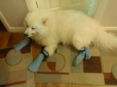 The shoes on the internet are cute but I don’t think he would keep them on his feet.   I think they are designed for maximum cuteness, but not much else.  These booties are designed for maximum your paws ain’t gettin’ outta these…