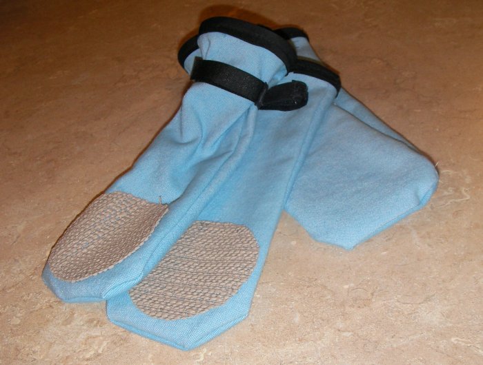 The booties are like sacks that are rounded at the bottom,  they velcro around the top of his foot so he’s not binded enough to be really uncomfortable and the velcro keeps the booties on his feet.