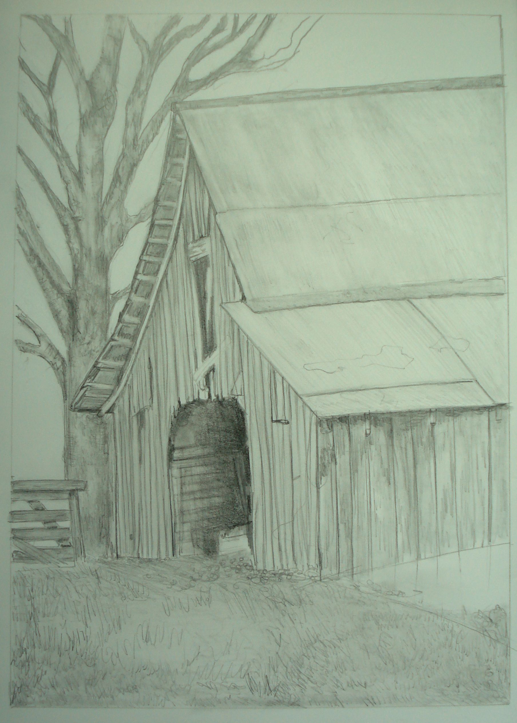 This is one of the projects that I have been working on. This piece is not very big sizing in at 5 1/2 x 7 3/4 in. but has been very challenging as well as taxing on my nerves. If you click on the image you will see that it’s about 70% complete and I have myself hemmed in a corner. In my ref picture there is a big evergreen covering most of my tin roof (coming from the right). I decided to leave that out. I really didn’t have problems with that, because I’ve seen enough tobacco barns in the span of my life to make an educated guess. On the lower bottom right, (the white area) is where a bush is supposed to go if I don’t change my mind. I’m still having problems with that tree. In the ref. picture it has leaves, and I didn’t block them out before I drew the tree, and now I don’t know what to do and I’ve been drawing around my problem. A commission came in that I need to get started on so thankfully, I don’t have to decide anything right now. I guess I could take the easy way out and make it a winter scene.