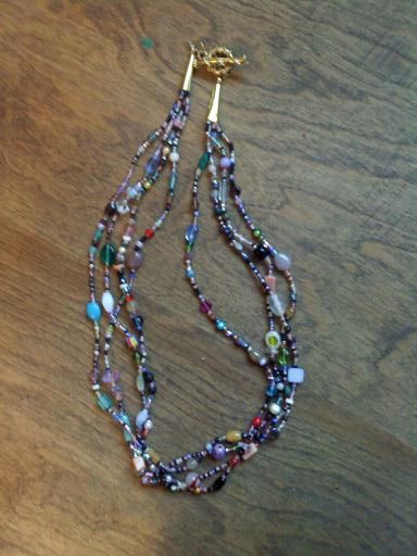 Here is the other necklace that I made a while back and I think that I don’t care for this much. You can’t really tell, but the beads on this necklace are so small that it took me days to string and vary from the lightest to the darkest of colors. This necklace would match my whole wardrobe. So why don’t I like it? Well, the toggle clasp is way too bulky and it’s made to look even more bulky by the cone findings. I don’t like the layering of the 4 strands either. I wasn’t going to post this, but I really like the look of the beads and I believe it would make a beautiful necklace, but there is something that I’m missing that would make this necklace really pretty! Right now, it’s boring, bulky and looks just thrown together. I welcome any ideas.