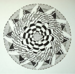 This is the new thing in the Zentangle world. It is adapted from the Indian mandalas. Zentangle + Mandala= Zendala! The traditional size for the official zentangle is about 3.5 inches (don’t quote me, it’s a guesstimate) but, I usually draw them a bit bigger. These eyes don’t work as well as the use to, so I like to go as big as possible. I think the Zendala is very ‘arty” and absolutely beautiful (IMO). I think it’s because there is a certain order and uniformity to the Zendala that really appeals to me. I still like the traditional Zentangling, and still do them often. I guess that’s all I have for now. I hope everyone enjoys warm weather and sunny skies for the week-end.