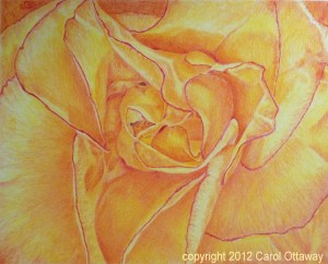 This is the colored pencil piece that I was telling you guys about from my last post.  The rose was painted using Derwent Coloursoft. I am pretty happy with the way it turned out.   The orginal is much brighter and has a lot more yellow than the picture above.  It took about a week to complete, it was difficult mapping my way through, but I can’t tell you how satisfying it is to actually complete something else in color (YAY ME!)  I want to add a few more floral close-ups to my collection to hang  in my new kitchen hopefully….sometime in the not so distant future…if the planets line up…and David gets some time.  He wants the kitchen done as bad as I do so  he’s not stalling, but scheduling has not been my friend.  One thing I am excited about is the demolition.  WOW WHAT A RUSH!  There is nothing quite as cathartic as taking a big ole hammer and tearing something up on purpose that is.  And if you ever get a chance too? Do it!
