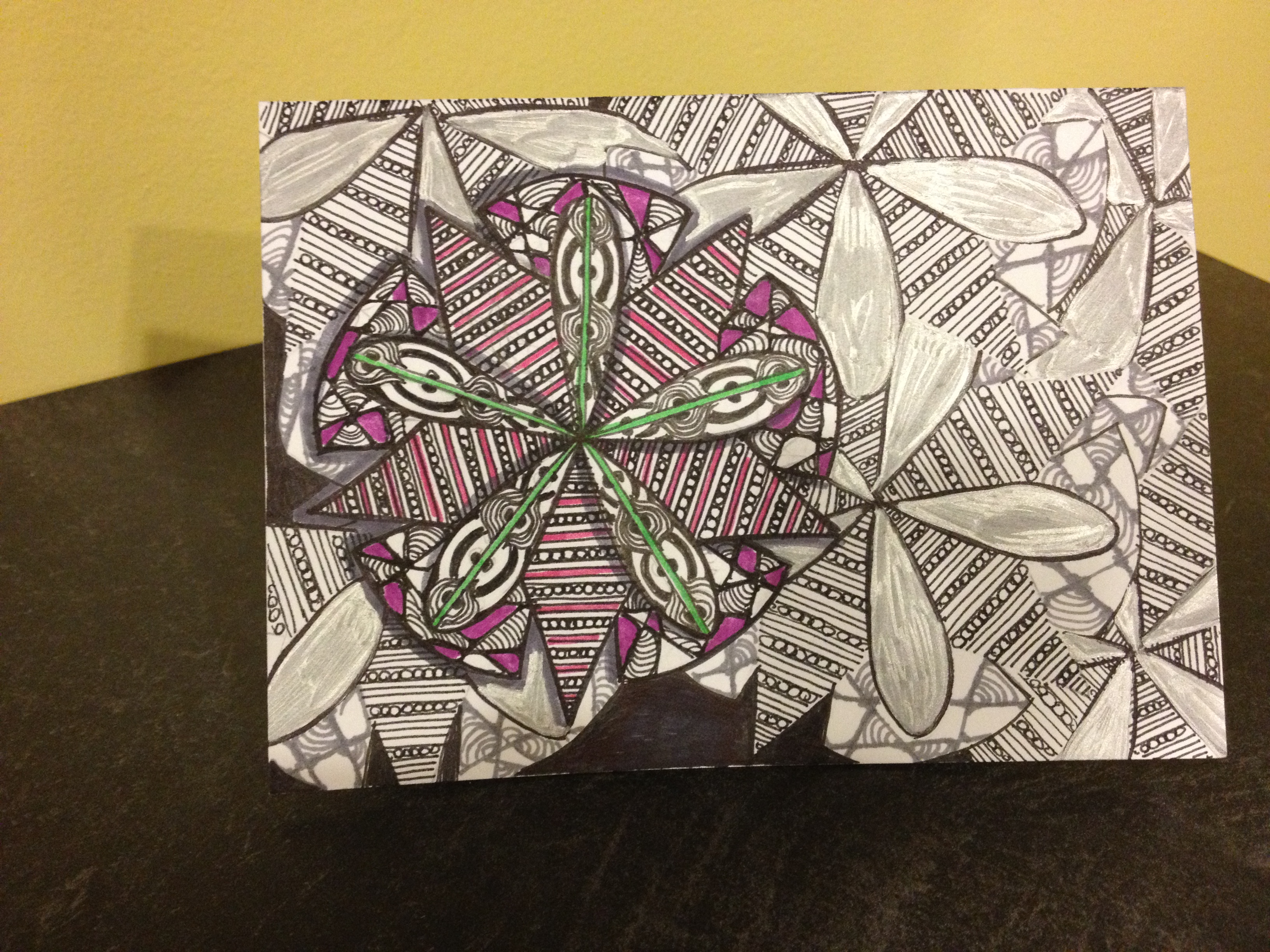 This Zendala is this weeks Bright Owl Challenge. As usual, I  love the design, but this work goes to show you that not every idea is golden.  This took me hours to complete, so I thought that after all that work, I had to at least post.  I have been using these designs as note cards, because even though they are fun to complete, I had to do something with them when they were done. Luckily for me, the women in my life seem to enjoy them.  But this one is a definite do over!  I wanted to overlap the designs in gray and silver as sort of a fade out.  And in my head it was really beautiful!  But in real life, I just got confused in the pattern and I couldn’t make anything light enough, my pen was bleeding, my eye sight was failing and it was a big ole….MEH!
