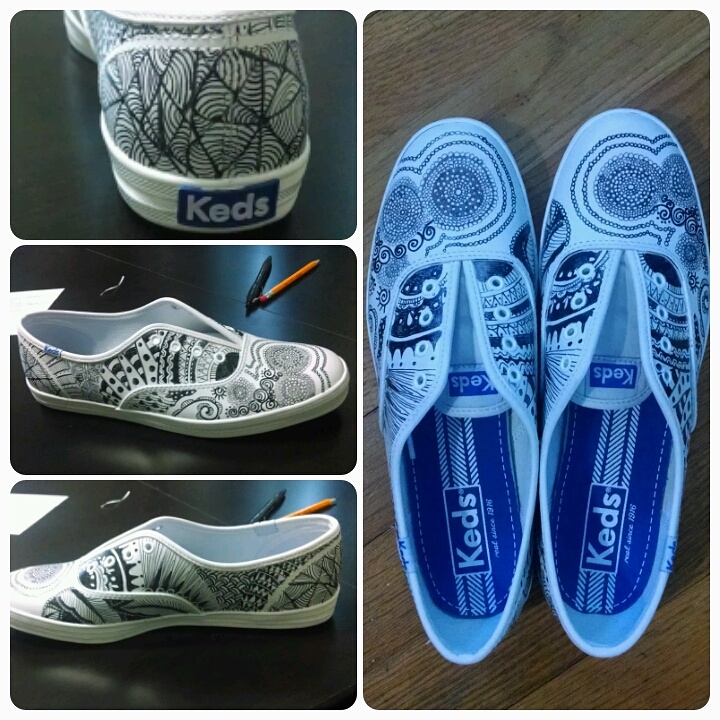 My sister-in-law and I zentangled shoes. She was good and finished hers, I just got too nervous. The shoes I was working on were leather so I waited until I got home to finish so I could use a soft pencil to make the design first. Vicki’s shoes are so cool and she’s a pro at zentangling!!!!