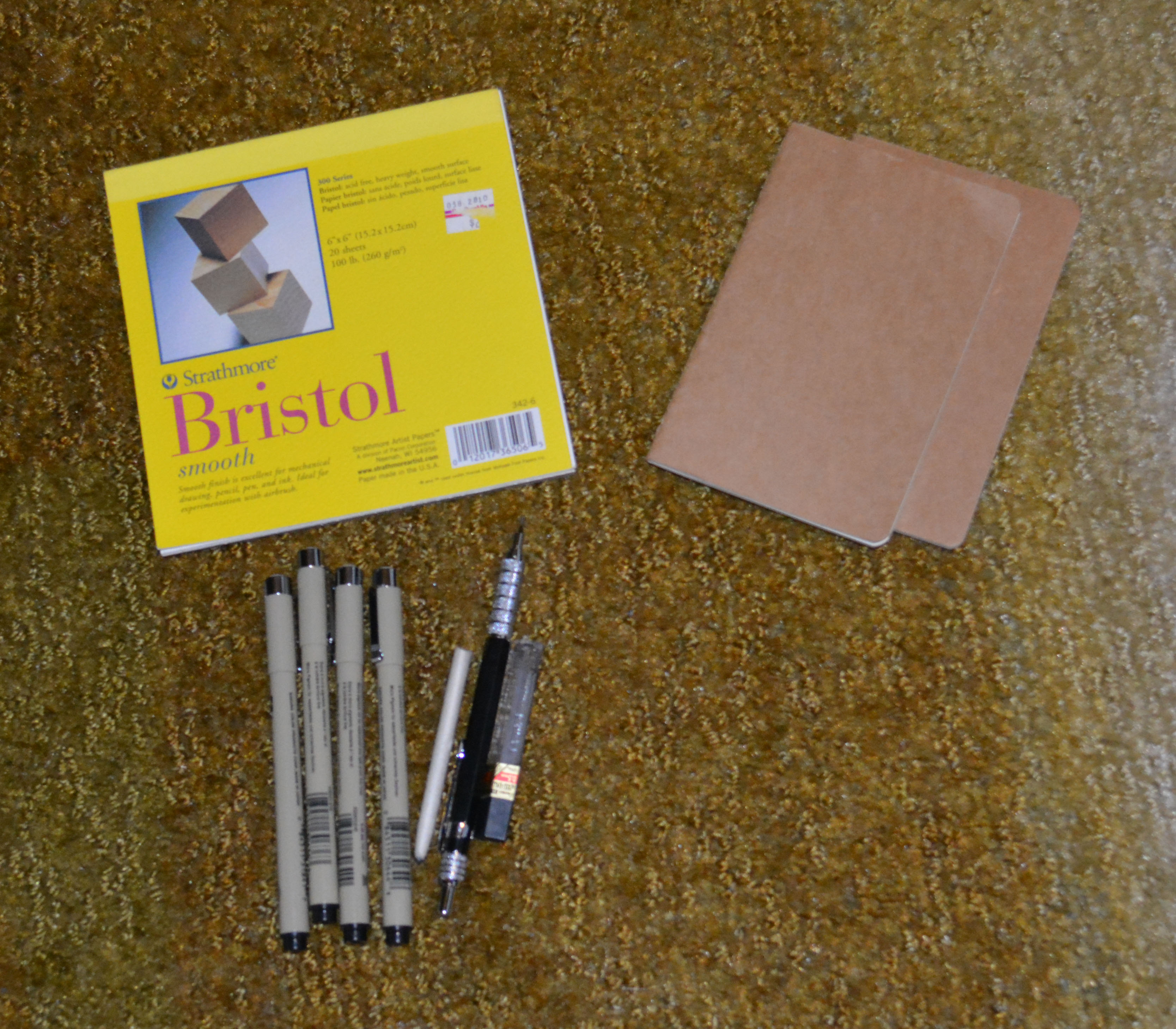 –400 Series Strathmore Drawing Pad – 8 x 10, 80 lb., pad is coiled so it folds flat (which is awesome). Paper has a slight tooth, but I still consider this a smooth(ish) paper.